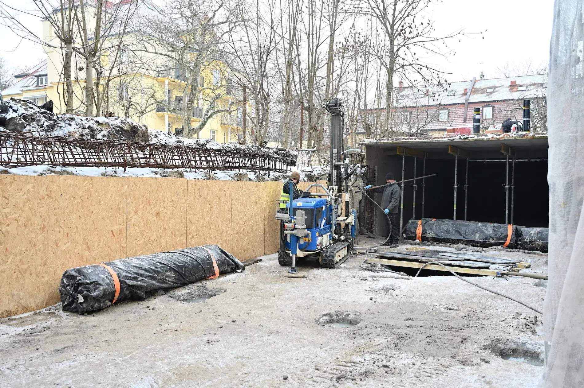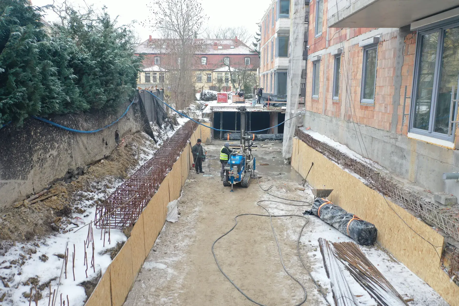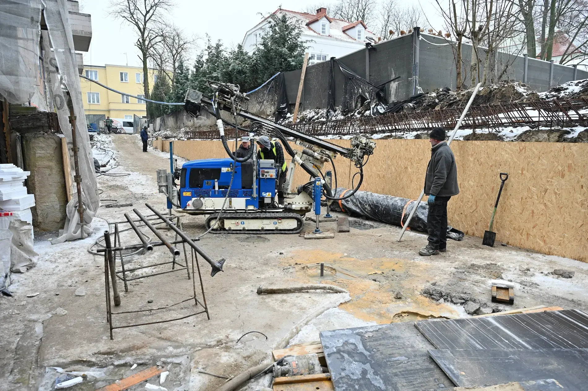 Zastosowane mikropale iniekcyjne zapewniły trwałe zakotwienie płyty wjazdu, wysoką nośność oraz bezpieczeństwo użytkowania garażu podziemnego.